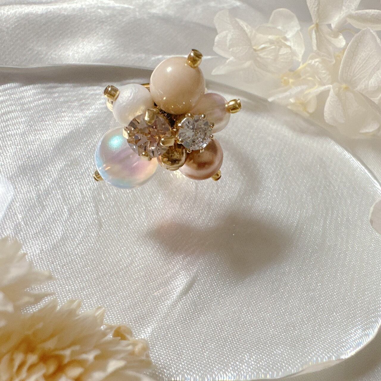 ピンクのクリスタルガラスと異素材のパールを組み合わせたリングです。